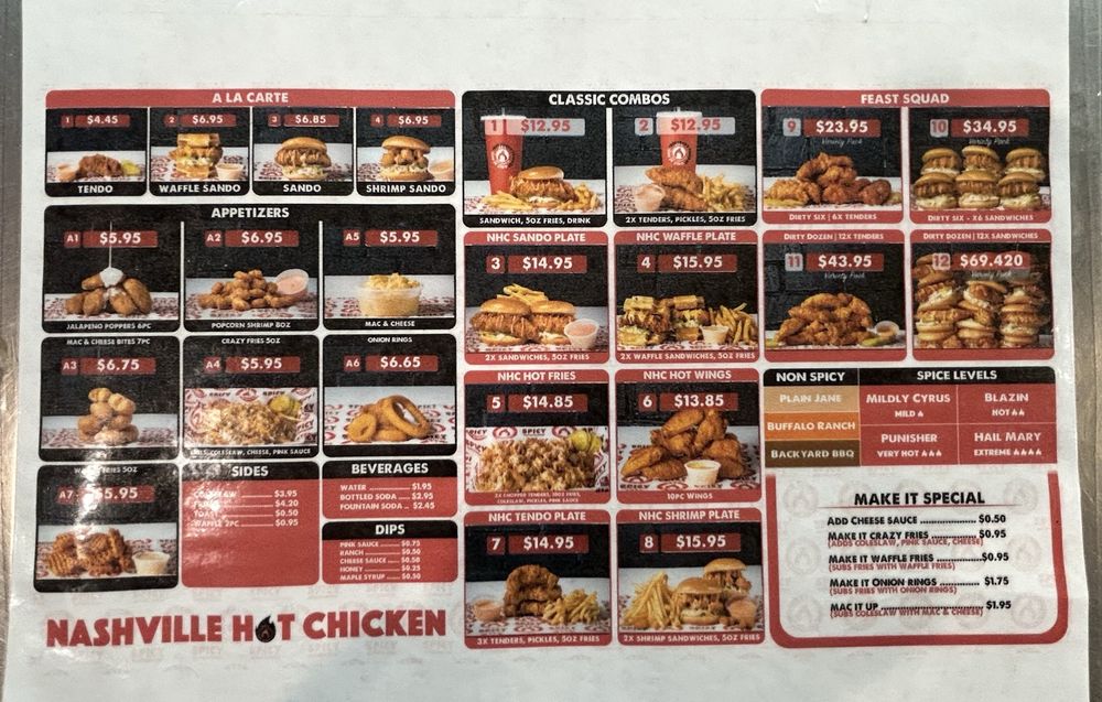The menu highlights the iconic Nashville hot chicken, offering a perfect balance of crunch and heat, served on a soft bun with a variety of toppings to suit every palate. Whether you prefer the classic or want to venture into more adventurous flavor profiles, NHC has something for you.